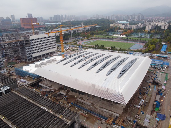 “體育中心項目主場館呈鉆石構造,屋蓋跨度為目前重慶高校體育場館之最,且類似張弦梁結構體系為目前重慶體育場館中首次應用!敝薪ò司种卮篌w育中心項目經(jīng)理陳丁介紹,體育比賽區(qū)主場館已基本完成外立面幕墻施工,金屬屋面曲線的美感與外立面白色鋁方通的結合相得益彰。目前,主場館室內機電消防管線已基本完成,室內精裝修也在有序進行,地面墻面的鋪裝正在大面積展開。