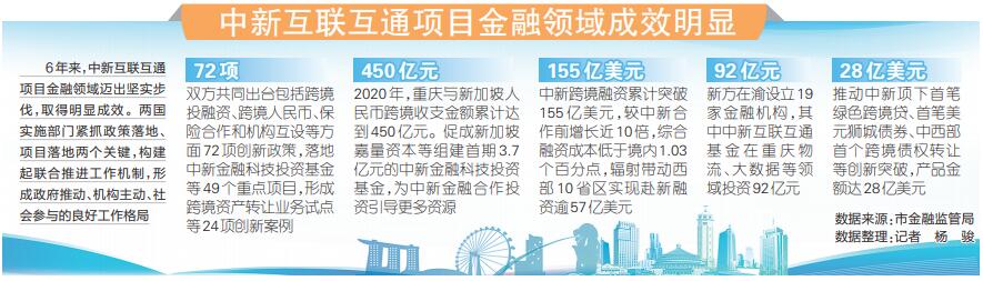 中新互聯(lián)互通項(xiàng)目落戶重慶6年來(lái),金融領(lǐng)域合作一直是中新雙方合作的重要內(nèi)容,且取得了顯著成效。