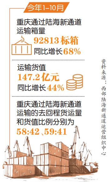今年1-10月,重慶通過陸海新通道運(yùn)輸箱量92813標(biāo)箱,同比增長(zhǎng)68%;運(yùn)輸貨值147.2億元,同比增長(zhǎng)44%。無論是貨量還是貨值,重慶均占通道運(yùn)輸總量超三成,在已加入通道共建機(jī)制的省區(qū)市中位居第一。