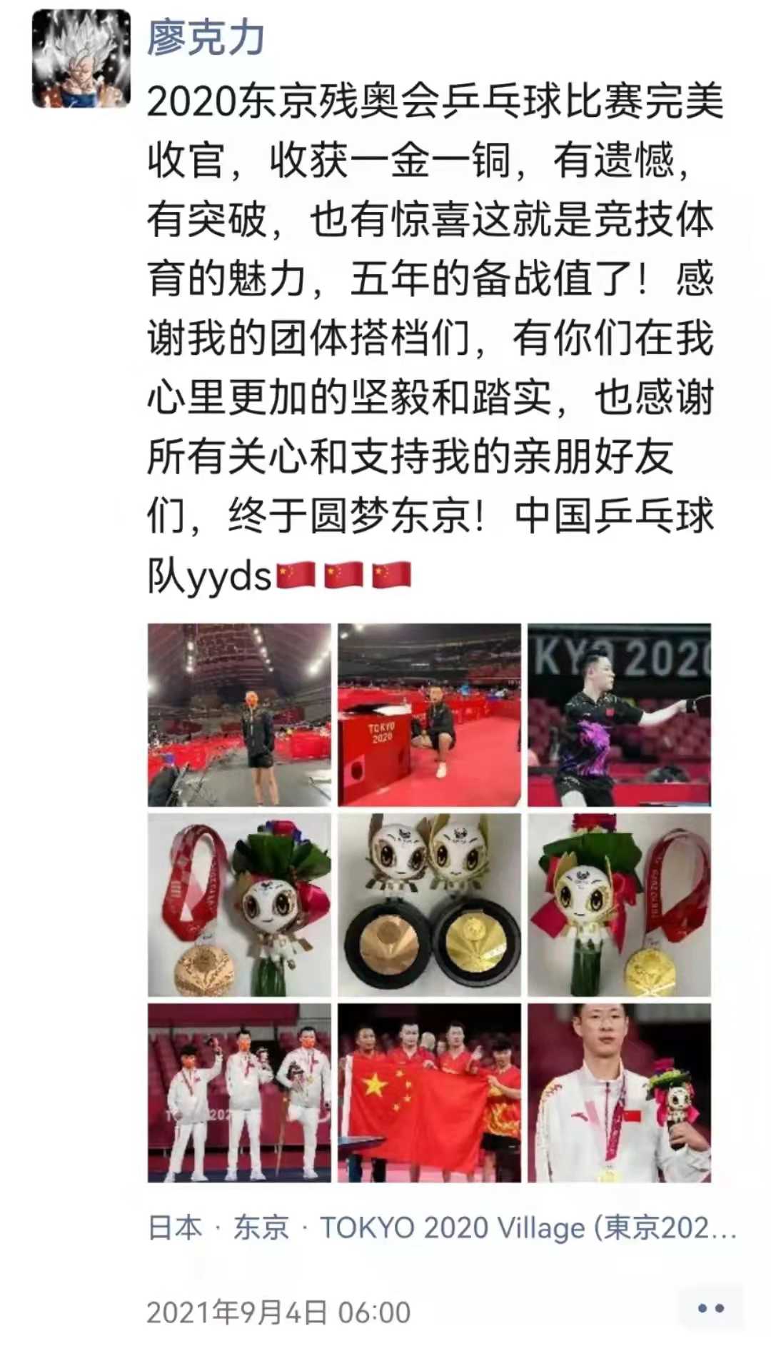 “收獲一金一銅,有遺憾,有突破,也有驚喜,這就是競(jìng)技體育的魅力,五年的備戰(zhàn)值了。感謝我的團(tuán)體搭檔們,有你們?cè)谖倚睦锔訄?jiān)毅和踏實(shí),也感謝所有關(guān)心和支持我的親朋好友們,終于圓夢(mèng)東京,中國(guó)乒乓球隊(duì)yyds。”