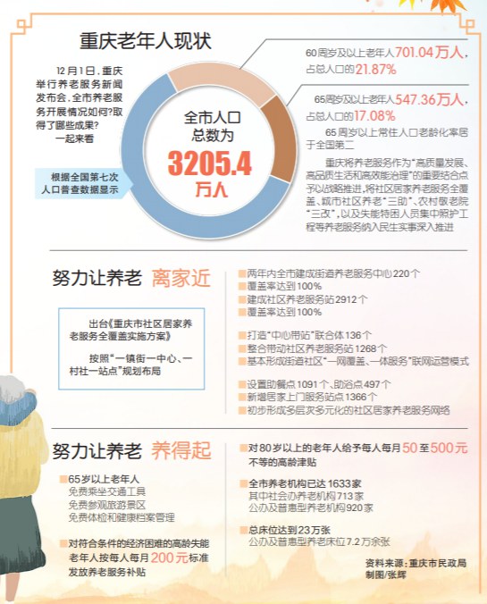 我市65周歲以上常住老年人547.36萬人,占比17.08%,65周歲以上常住人口老齡化率居于全國第二。養(yǎng)老問題已成為社會關(guān)注的熱點(diǎn)和焦點(diǎn),重慶在養(yǎng)老服務(wù)上做出了怎樣的努力?12月1日,市政府召開重慶市養(yǎng)老服務(wù)新聞發(fā)布會,詳解重慶養(yǎng)老服務(wù)的成績和經(jīng)驗(yàn)。