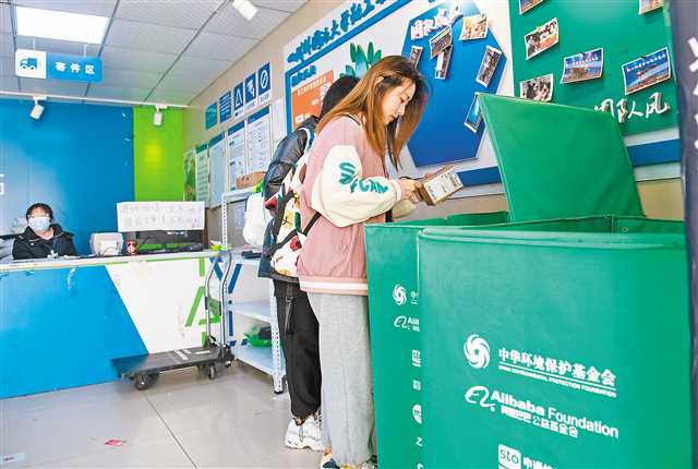 12月2日,九龍坡黃桷坪鐵路三村菜鳥驛站,市民將快件包裝盒拆下后放入回收箱,就可在網(wǎng)上申領(lǐng)獎品。記者 羅斌 攝/視覺重慶