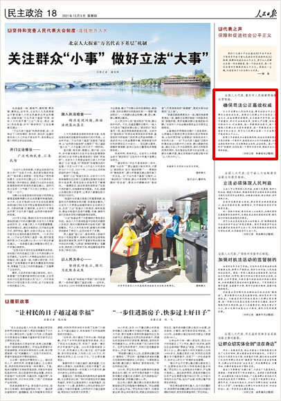 黨的十九屆六中全會(huì)通過的《中共中央關(guān)于黨的百年奮斗重大成就和歷史經(jīng)驗(yàn)的決議》強(qiáng)調(diào),保障和促進(jìn)社會(huì)公平正義,努力讓人民群眾在每一項(xiàng)法律制度、每一個(gè)執(zhí)法決定、每一宗司法案件中都感受到公平正義。圍繞這一主題,記者采訪了4位全國(guó)人大代表。