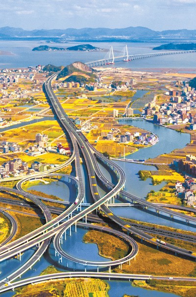 與樂清灣大橋連接的立交橋縱橫交錯。樂清灣大橋及接線工程通車后,從浙江省溫州樂清駕車到臺州玉環(huán)時間從3個小時縮短至20分鐘。 竇瀚洋 林郁杰攝影報道