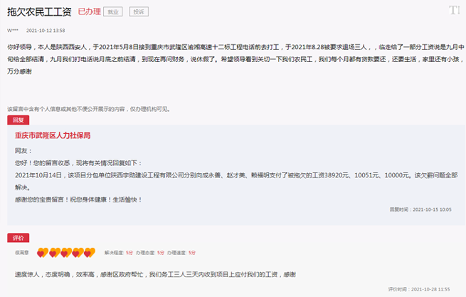 重慶市武隆區(qū)人力社保局回復(fù): 2021年10月14日,該項目分包單位陜西宇勛建設(shè)工程有限公司分別向三人支付了被拖欠的工資38920元、10051元、10000元,該欠薪問題全部解決。感謝您的寶貴留言,祝您身體健康,生活愉快!
