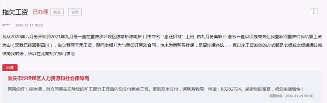“我從2020年6月到2021年9月,一直在沙坪壩區(qū)陳家橋陳南路門市‘忠旺鋁材’上班。自九月離職后,老板一直找借口拖欠我兩千元工資,在此向相關(guān)部門求助!