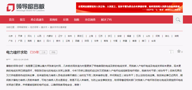 人民網(wǎng)重慶12月14日電 (陳琦)家門口的電線桿,年久失修,破損十分嚴(yán)重,反映多次無果……11月24日,有網(wǎng)友在人民網(wǎng)“領(lǐng)導(dǎo)留言板”留言,希望維修人員能盡快上門維修,確保家里用電安全。收到留言后,重慶市綦江區(qū)橫山鎮(zhèn)相關(guān)部門介入,該網(wǎng)友反映的問題得到了解決。