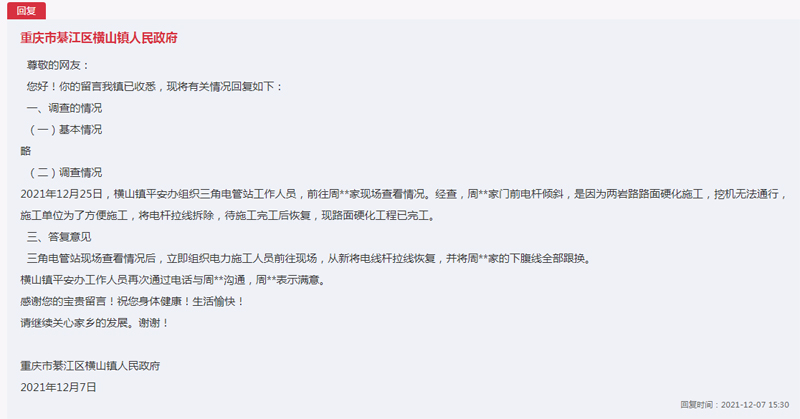接到留言后,重慶市綦江區(qū)橫山鎮(zhèn)人民政府立即安排有關(guān)部門解決此事。11月25日,橫山鎮(zhèn)平安辦組織三角電管站工作人員,前往網(wǎng)友家現(xiàn)場(chǎng)查看了情況。經(jīng)查,網(wǎng)友家門前電桿傾斜,是因?yàn)槁访嬗不┕,施工單位為了方便挖機(jī)通行,將電桿拉線拆除,現(xiàn)硬化工程已完工。