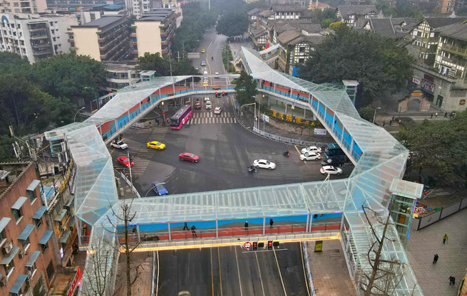 南坪西路空中聯(lián)廊項(xiàng)目位于南坪商圈西部,連接南坪西路、海銅路和花園路。項(xiàng)目全長287.7米,天橋主體結(jié)構(gòu)為組合鋼箱梁鋼橋體、鋼筋混凝土橋墩,最大跨度42米。聯(lián)廊采用極簡現(xiàn)代設(shè)計(jì),外觀借助中國傳統(tǒng)民居“坡屋頂”樣式,頂棚采用多斜面納米自潔玻璃,整體風(fēng)格與旁邊的重慶映象商業(yè)街協(xié)調(diào)輝映。