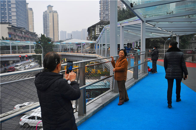 人民網(wǎng)重慶12月16日電 高顏值、有升降電梯、夜晚燈光璀璨……今日,南坪商圈民生工程南坪西路空中聯(lián)廊正式投用,不少市民陸續(xù)走上新橋進(jìn)行體驗(yàn)。