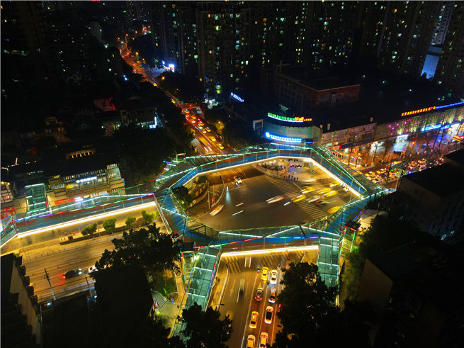 空中聯(lián)廊夜晚炫彩亮麗的燈光。郭旭攝