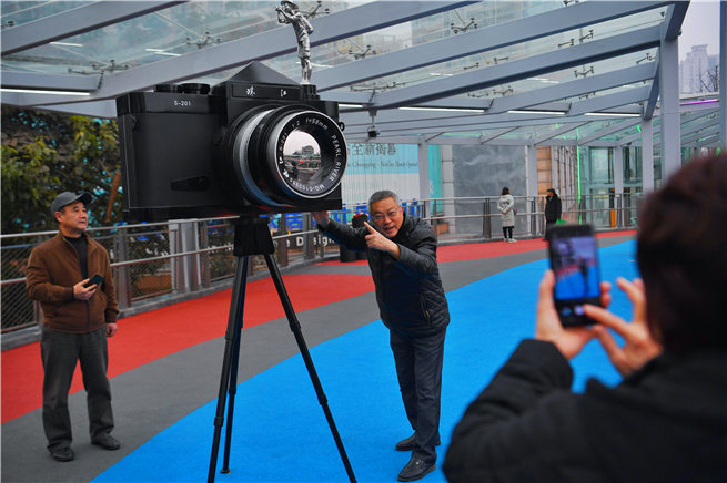 “珠江牌”相機(jī)廠區(qū)曾位于南坪光電路,聯(lián)廊上的雕塑吸引市民打卡。郭旭攝