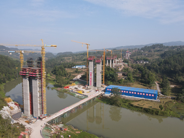 渝湘復(fù)線高速公路大溪河特大橋百米級主墩封頂