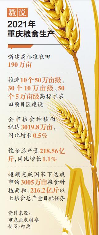今年以來,重慶堅決遏制耕地“非農化”、防止“非糧化”,交出了一份合格的糧食生產成績單——2021年重慶糧食種植面積達3019.8萬畝,同比增長0.5%;糧食總產量218.56億斤,同比增長1.1%,超額完成國家下達我市的3005萬畝糧食種植面積、216.2億斤以上糧食總產量目標任務。