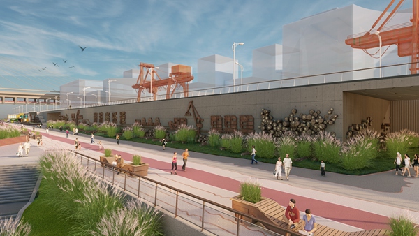 茄子溪段項目北至萬發(fā)碼頭、南至濱江路跨線橋、總長度2.4公里,總面積49.2公頃。結(jié)合港口的發(fā)展歷史和遺留下來的工業(yè)遺產(chǎn),將港口文化代表的現(xiàn)代國際與潮流音樂代表的前沿藝術(shù)相融合,提出潮流音樂港的主題定位。針對現(xiàn)狀單調(diào)的線性空間,設(shè)計通過港口轉(zhuǎn)型,江岸活力道,生態(tài)環(huán)境微平臺等打造,打造一條具有韻律變化的潮音水岸,未來成為重慶聚集潮流文化的新地標(biāo)。