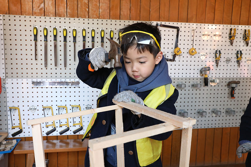 新村幼兒園兒童用工具制作木架。葉澤陽攝