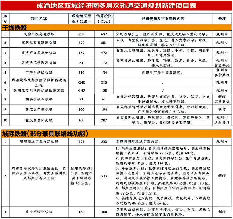 成渝主軸——依托成渝北線、中線和南線綜合運(yùn)輸通道,利用既有滬漢蓉鐵路成遂渝段、成渝高鐵,以及規(guī)劃建設(shè)的成渝中線高鐵等干線鐵路開行城際列車,加強(qiáng)重慶、成都“雙核”之間快速聯(lián)系,支持重慶向西、成都向東拓展。