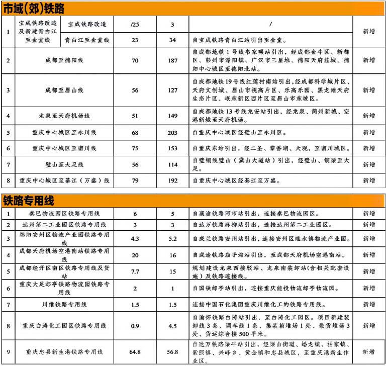 以服務(wù)便捷通勤為重點(diǎn),圍繞支撐重慶、成都都市圈,優(yōu)先利用既有鐵路資源,通過優(yōu)化運(yùn)輸組織、補(bǔ)強(qiáng)既有鐵路、改擴(kuò)建局部線路、改造站房站臺、增建復(fù)線支線及聯(lián)絡(luò)線、增設(shè)車站等方式公交化開行市域(郊)列車,有序新建市域(郊)鐵路,有機(jī)銜接中心城區(qū)城市軌道交通,打造1小時都市交通圈、通勤圈。