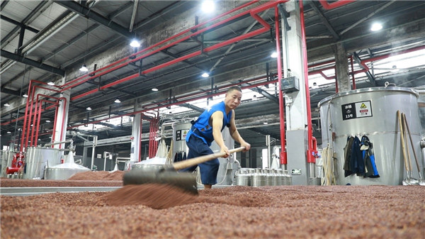 車間里一片火熱的景象,泡糧蒸煮、培菌糖化、入窖發(fā)酵、蒸餾出酒,三五人一組,各司其職,環(huán)環(huán)相扣,“一個車間兩班倒,一個班就有一百七十來號人,許多酒廠的規(guī)模都比不上我們一個車間。”