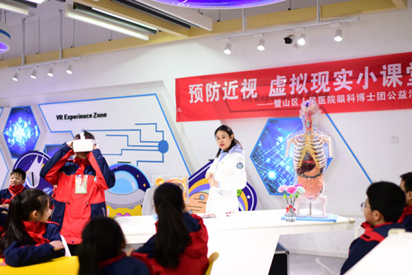 課堂上,璧山區(qū)人民醫(yī)院眼科博士團(tuán)通過(guò)“虛擬現(xiàn)實(shí)VR技術(shù)”介紹了雙眼視覺(jué)基礎(chǔ)、調(diào)節(jié)與近視的關(guān)系、讓孩子感知雙眼單視帶來(lái)的立體視覺(jué)的感受,并讓孩子們近距離體驗(yàn)“虛擬現(xiàn)實(shí)+醫(yī)療”的神奇魅力,讓孩子們認(rèn)識(shí)到預(yù)防近視的重要意義。