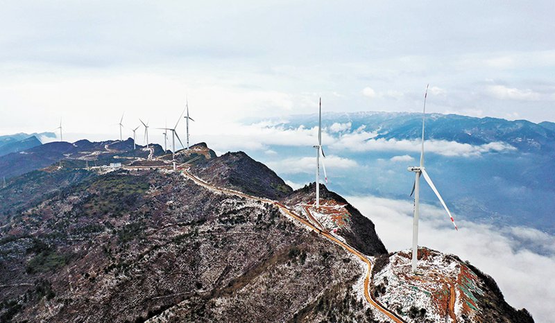 2021年12月30日,積雪和云霧掩映著黔江區(qū)五福嶺風(fēng)力發(fā)電場。