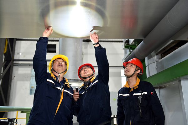 西南鋁技術(shù)員查看熱處理爐鋁板表面質(zhì)量。李影攝