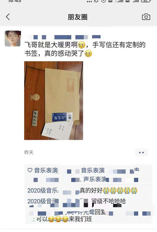 “不止是期末給我們每個(gè)人一封專屬信,飛哥一直都很暖。“西南大學(xué)音樂(lè)學(xué)院2021級(jí)崔同學(xué)稱,飛哥很有心,他入學(xué)報(bào)到第一天,飛哥來(lái)寢室,居然喊出了他的名字。