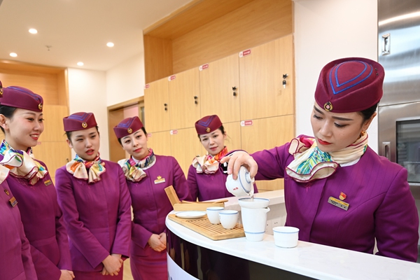 乘務(wù)員正在進(jìn)行禮儀培訓(xùn)。龍嘉麗攝