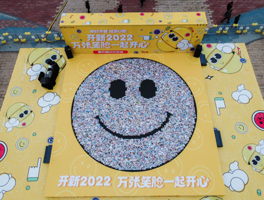 1月15日,重慶融創(chuàng)文旅城“你好開心,快樂U你”的萬人笑臉挑戰(zhàn)賽落地,百名歡樂體驗官用一萬多張照片拼湊成約百平的大笑臉。