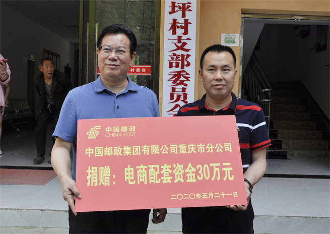 重慶郵政黨委書記、總經(jīng)理代表重慶郵政向城口縣雙坪村捐贈(zèng)電商配套資金。