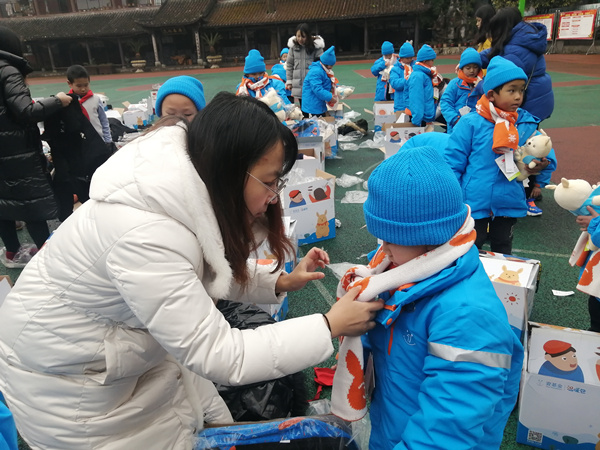 愛(ài)心團(tuán)委為孩子們送上新春禮物。王寧波攝