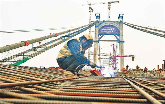 1月24日,郭家沱長(zhǎng)江大橋施工現(xiàn)場(chǎng),工人正在加緊作業(yè)。臨近春節(jié),郭家沱長(zhǎng)江大橋的建設(shè)者們堅(jiān)守崗位,加緊施工,確保工程進(jìn)度。目前大橋已吊裝39片鋼桁梁,完成總進(jìn)度的67%。