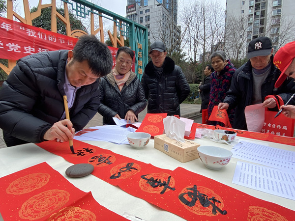 在現(xiàn)場,轄區(qū)共建單位書法老師還和社區(qū)老黨員們一起為居民寫春聯(lián),并邀請現(xiàn)場愛好書畫的居民一同書寫家風(fēng)家訓(xùn)和新年祝福。社區(qū)一名已退休居民表示:“在活動中,居民間通過交流增進了感情,將自己書寫的大紅春聯(lián)貼在家門口顯得特別有意義,感謝社區(qū)組織的活動!