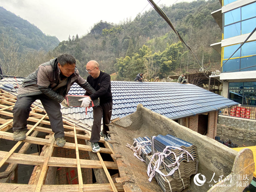 羅淵(右)在為新建的臘肉加工房蓋瓦。人民網(wǎng) 劉政寧攝