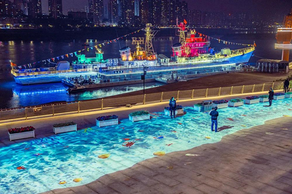 在重慶建川海疆博物館景區(qū)內(nèi),15臺激光投影儀將一條兩百多米長的沙灘投射在了地面:海浪不時拍打在沙灘上,不少魚、蝦、螃蟹正在水里游動,非常逼真。同時,為了增添景區(qū)夜間的觀賞性,制作方還采用了雷達技術,讓游客得到沉浸式的互動體驗:當人在沙灘上來回散步時,腳下會出現(xiàn)一朵朵浪花,仿佛讓人身臨其境。