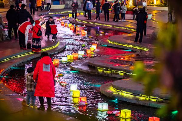 在三峽廣場轉(zhuǎn)了一大圈,燈飾確如楊佳所說,別致精美、恢弘大氣,獨(dú)具審美情趣,更點(diǎn)亮了夜空,照耀出年味。燈飾分為“金虎迎新開門紅”“詩意沙坪壩”“箏鳴琴瑟天下幽”“勿忘黃天厚土滋潤”四個主題部分,與商圈景觀結(jié)合,使用祈福燈、紅楓等多種燈飾及造型景觀,重現(xiàn)了虎嘯山林、花燈祈福、農(nóng)家風(fēng)情以及詩意沙坪壩等多重景象。