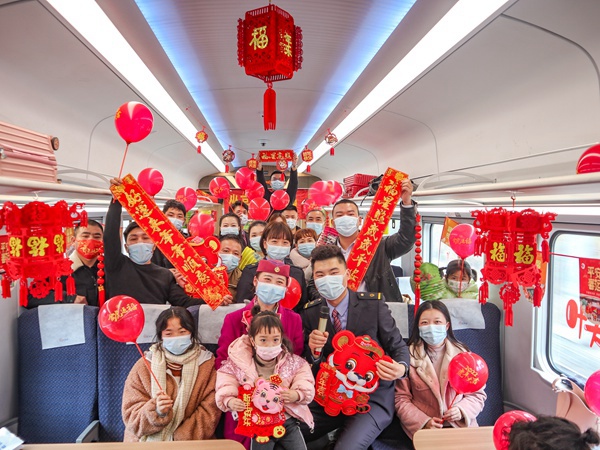 1月28日,C451次列車上張燈結(jié)彩、歡聲笑語!案魑宦每,除夕即將來臨,在這辭舊迎新之際,我們歡聚一堂,敬請大家觀看由我們鐵路職工帶來的高鐵‘春晚’。”隨著列車長王華的邀請,旅客們紛紛就坐在鐵路職工精心布置的車廂。車窗上粘貼的喜慶窗花、五彩的燈籠和拉花.......一股濃濃的年味撲面而來,讓整個車廂氣氛熱情洋溢,溫馨盎然。
