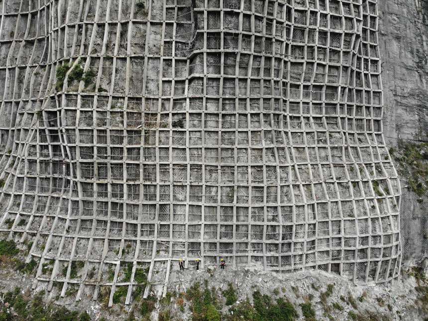 “大家系好安全繩帶,一步一步踩穩(wěn)了跟我過去。”接下來的檢測(cè),要爬著防護(hù)設(shè)施橫向移動(dòng)。防護(hù)設(shè)施包裹危巖絕壁的下方,看起較為緩和,但坡度也有60度至70度,檢查過程中,不時(shí)有踩到的小石頭向下滑落!安确(wěn)了再走就沒事的,下面有被動(dòng)網(wǎng),石頭和你都滾不下去的。”方劍看到班組今年新入路的青工有些害怕,開玩笑地說著,來緩解青年工友的緊張。