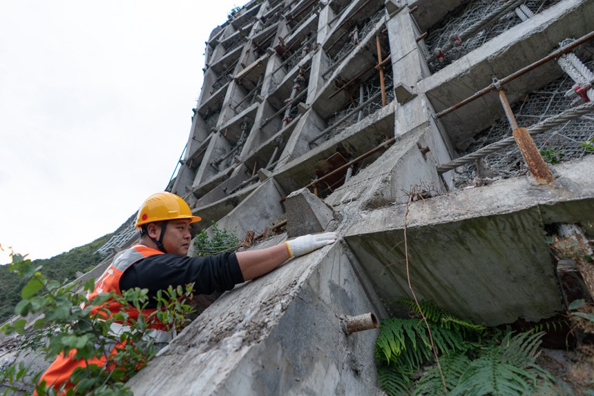 擔(dān)心工友的安全,盡管說的是玩笑話,方劍語氣也帶著認(rèn)真。他一邊組織大家做好安全防護(hù),一邊提醒著作業(yè)安全。設(shè)備檢查過程中,他帶著4名職工一步一停頓地橫著山體向前移動(dòng),對(duì)防護(hù)設(shè)施底部每一根橫豎交叉的混凝土框架梁進(jìn)行仔細(xì)檢查。每檢查一處,他們都要在現(xiàn)場(chǎng)和工作本上做好記錄。