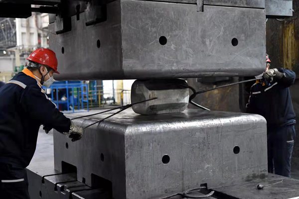 西南鋁鍛造廠模壓線職工在生產(chǎn)鋁合金模鍛件胚料。西南鋁公司供圖