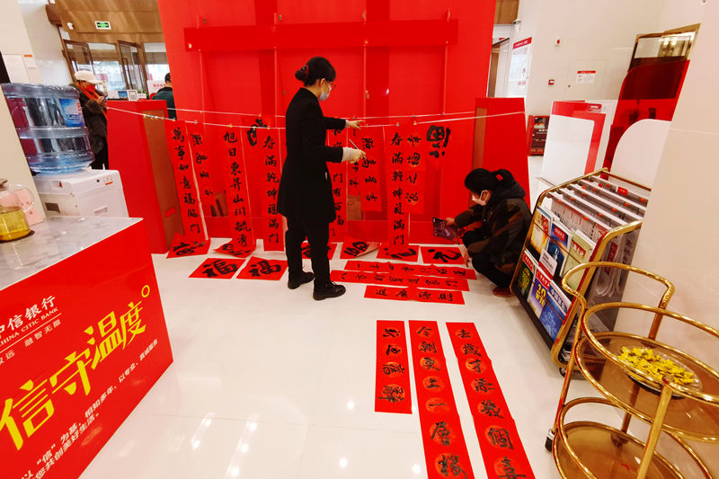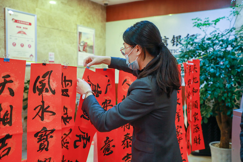 在中信銀行重慶沙坪壩支行,一副副洋溢著喜慶、散發(fā)著墨香的手寫(xiě)春聯(lián)和福字將廳堂裝扮得紅紅火火,喜氣洋洋。