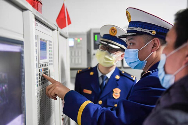 在順江特勤站交接班上,石亞斌認真檢查一號車水槍。張龍攝