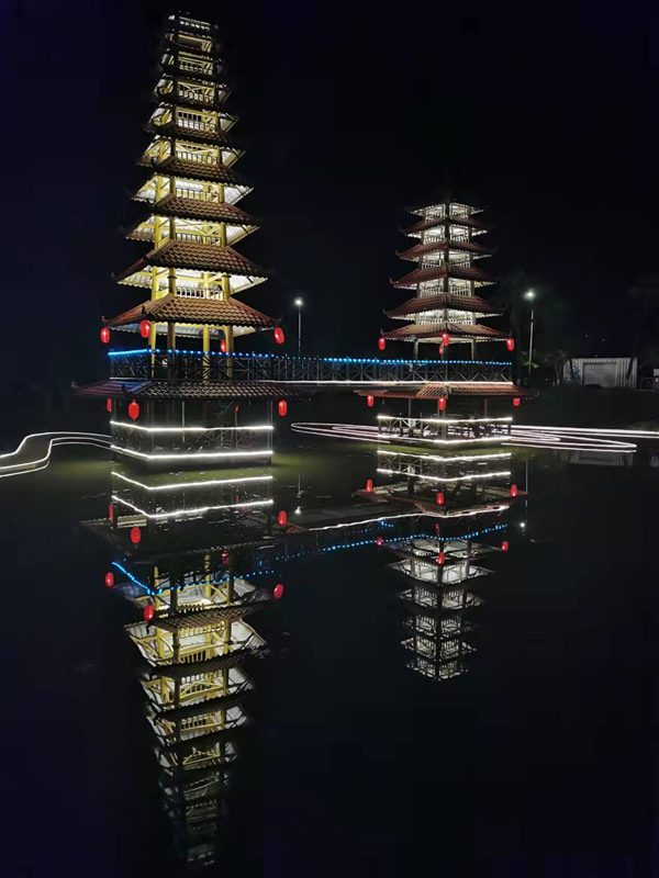 位于美心湖中央的“雙塔映月”燈飾。涪陵區(qū)委宣傳部供圖
