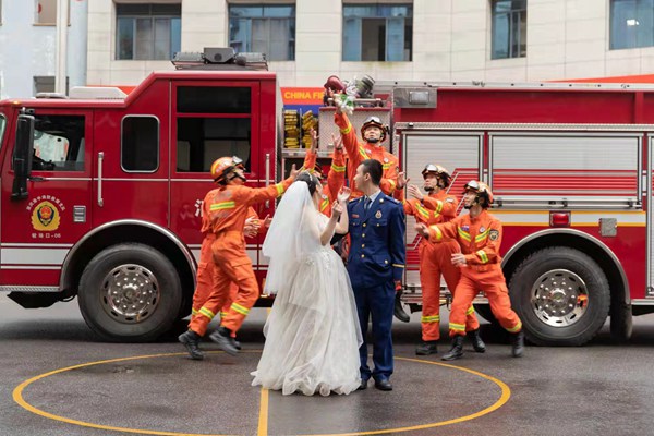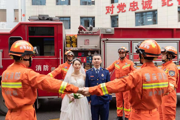 王飛在重慶市渝中區(qū)較場口消防救援站拍攝的婚紗照。受訪者供圖