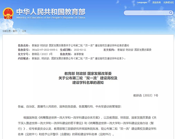 據(jù)悉,根據(jù)國(guó)務(wù)院《統(tǒng)籌推進(jìn)世界一流大學(xué)和一流學(xué)科建設(shè)總體方案》,以及教育部、財(cái)政部、國(guó)家發(fā)展改革委《關(guān)于深入推進(jìn)世界一流大學(xué)和一流學(xué)科建設(shè)的若干意見》和《統(tǒng)籌推進(jìn)世界一流大學(xué)和一流學(xué)科建設(shè)實(shí)施辦法(暫行)》,經(jīng)專家委員會(huì)認(rèn)定,教育部等三部委研究并報(bào)國(guó)務(wù)院批準(zhǔn),公布了第二輪“雙一流”建設(shè)高校及建設(shè)學(xué)科名單和給予公開警示(含撤銷)的首輪建設(shè)學(xué)科名單。