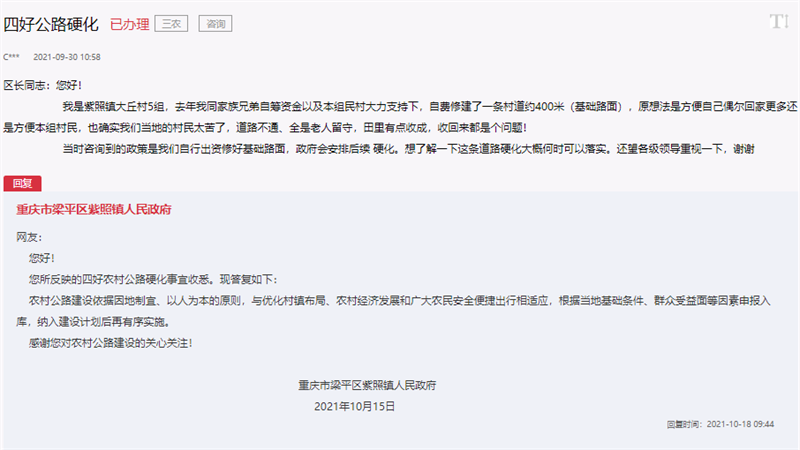 原來,2021年9月30日,這名網(wǎng)友在人民網(wǎng)“領(lǐng)導(dǎo)留言板”留言反映,他們家族兄弟于2020年自籌資金,在本組村民的支持下,自費(fèi)修建了一條約400米的村道(基礎(chǔ)路面)。當(dāng)時(shí)了解到的政策是村民自行出資修好基礎(chǔ)路面后,政府會安排后續(xù)硬化。想了解一下這條道路硬化大概何時(shí)可以落實(shí)?