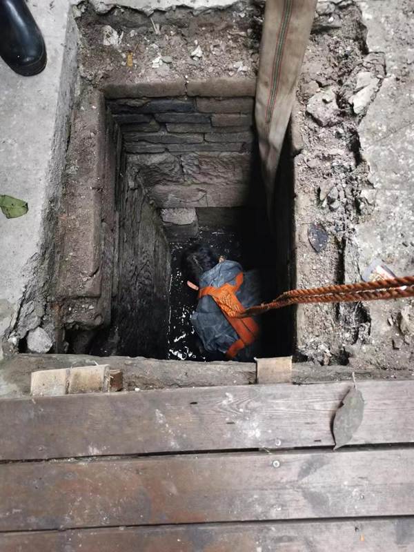 污水排完,化糞池底部沉積巨量淤泥,云梯插入,沒入第四個(gè)扶手處,王勇下池,用工具開始清理,上方同事對(duì)清出的淤泥進(jìn)行裝袋處理,“有異味,不能影響周圍居民,要堆放后及時(shí)運(yùn)輸!