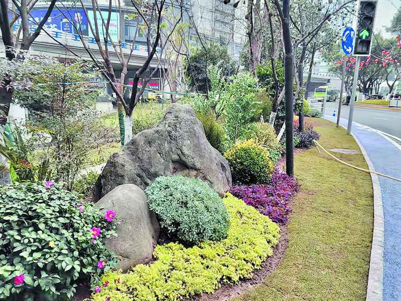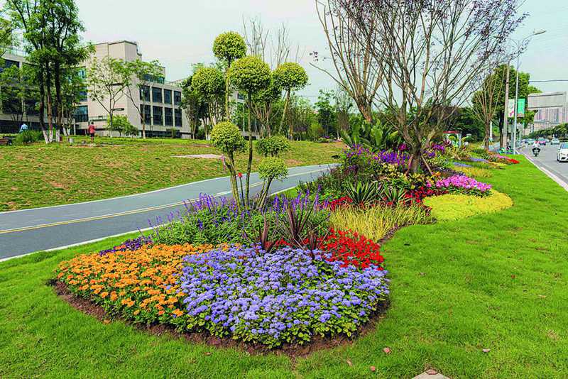 九龍坡區(qū)在街頭綠化中精心打造花境。 九龍坡區(qū)城市管理局供圖。