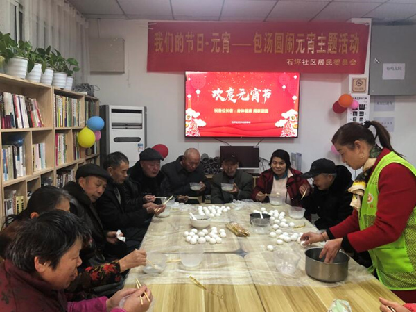 在玉峰山鎮(zhèn)石坪社區(qū),老人們圍坐一堂,志愿者們拿出提前準備好的糯米面粉、湯圓餡,讓老人們親自動手包湯圓。在揉面、拌餡、搓湯圓的過程中家長里短、你說我笑,氣氛熱烈。不一會兒,象征團圓的湯圓端上桌,老人和志愿者們開心地品嘗著自己制作的湯圓。志愿者隨后還將煮好的湯圓送到了腿腳不便的94歲老人段前民家中,吃著湯圓,老人開心地笑了。