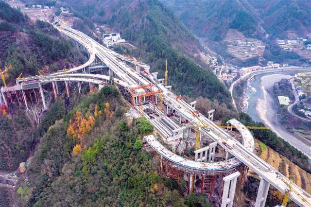 不止是隧道。2月13日,渝湘復(fù)線高速巴彭段雙堡特大橋項(xiàng)目現(xiàn)場(chǎng)一大早就聚集了200多名管理和施工人員,主跨之間的4臺(tái)塔吊不停做著“體轉(zhuǎn)運(yùn)動(dòng)”。大橋橋面距谷底最深處超過300米,目前,支撐大橋主跨的主墩正以一天1米的速度“瘋狂生長(zhǎng)”。